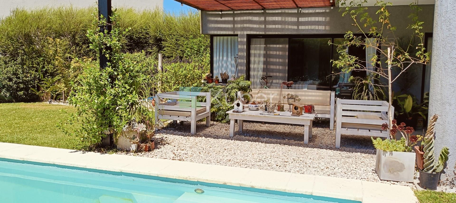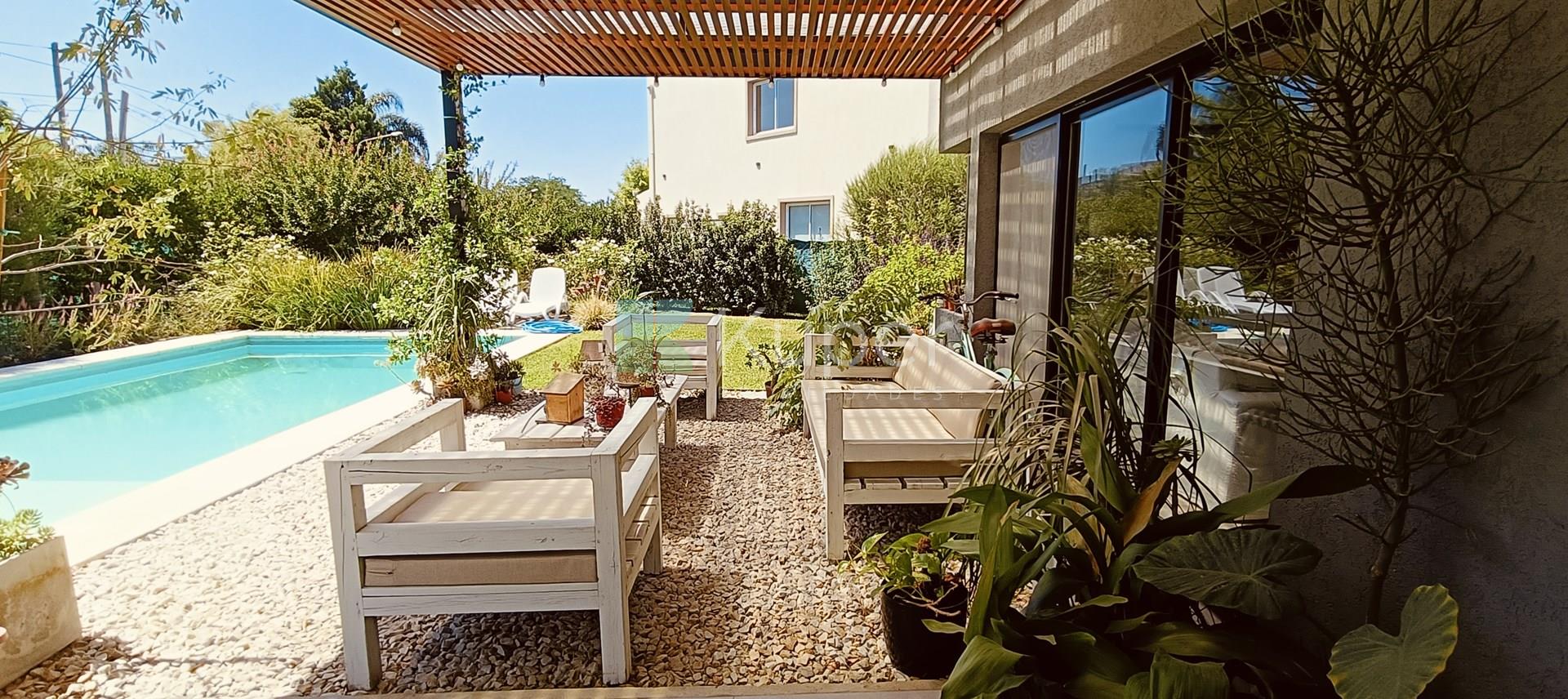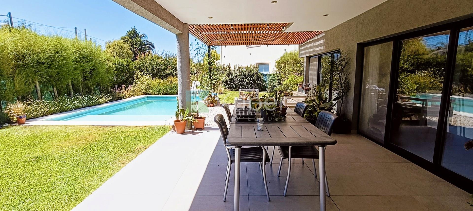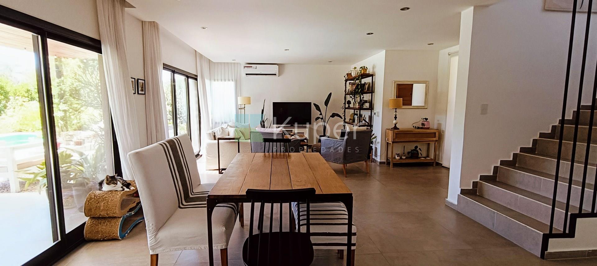 Muy linda casa en venta diseñada con buen gusto y en cada detalle, se destaca por su luminosidad y su conexión con la naturaleza. Al ingresar, te recibirán espacios amplios y bien iluminados, con grandes ventanales que permiten que la luz natural sea suficiente durante el día. Pb: living comedor integrado a la cocina con la posibilidad de cerrar el ambiente con una puerta corrediza. Toilette. Lugar de guardado bajo escalera. Tiene ingreso por la parte de servicio y por el estacionamiento techado. Lavadero, escritorio. Pa: Suite principal con vestidor y baño completo, linda terraza que da al jardín - pileta. 2 dormitorios que comparten un baño. Ambos dan a una terraza. Exterior: amplia galería con parrilla y bacha con pérgola que extiende la misma. Riego por aspersión. El toque verde está presente gracias a las plantas que decoran el exterior, creando un ambiente fresco y acogedor. La cocina es funcional y sofisticada, ideal para disfrutar de momentos en familia. Características de construcción: aa frío /calor, calefacción por losa radiante eléctrica. Pisos de porcelanato, aberturas doble vidrio.
